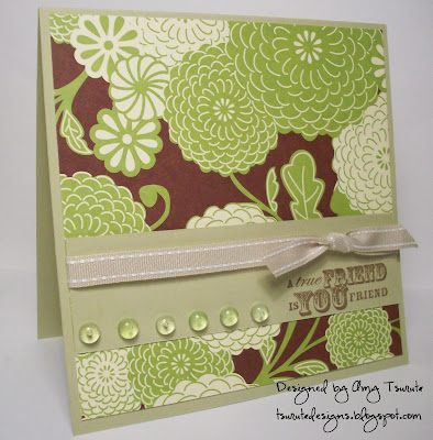 stamps: b line designs ink: versafine vintage sepia paper: stampin' up chocolate chip, misc ivory accessories: stampin' up pretties kit, wide dark brown grosgrain from rabom, wide green stitched grosgrain from old navy, my janome...I've missed her....lol