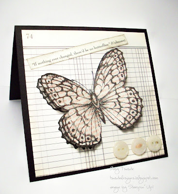 I bought the Stipple Butterfly off of the SCS b/s/t board. I've been wanting it for a while and finally found one. I think that I'll get my $ worth out of it. I've been working hard to incorporate buttons onto my cards. I have a TON of them...The three on this card are vintage. I have been fortunate in receiving old buttons from a handful of people.
