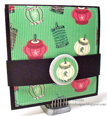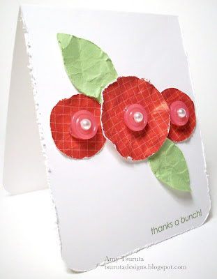 I was going to dig through my various stashes of pattern paper for this challenge but boy, I tell you, it was much too hot for that. I went easy smeasy clean & crisp! I used retired SU Riding Hood Red dp for the flowers and Certainly Celery for the leaves. The buttons are from my vintage stash and the rub on is SU. I'm trying to consistently "dress up" my buttons so decided to slap on some Kaiser Craft pearls this time.