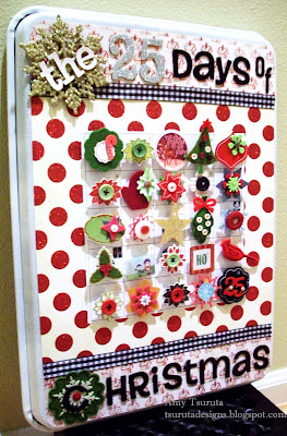 Yuppers...it is an Advent Calendar...actually a cookie sheet Advent Calendar....I was so very inspired by this one on the Pink Paislee blog. I know! Gorgeous...isn't it??!!! Her's was much more labor intensive, I used all pre-made embellies by Making Memories, Basic Grey and Stampin' Up.