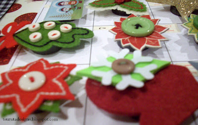 I switched out my teflon cookie base with another silver cookie sheet...even spray painted it white {patting myself on the back for doing that..} only to find out that the magnets wouldn't stick...I thought that they had earlier...cripes...so then I started ripping off the semi-expensive magnets off the backs of the embellies thinking that I would make another advent calendar and use those magnets...I did that to about 5 days of embellies and then realized that I liked the 'height' that the magnets gave the embellies...grrrrr....so I put them back onto the embellies.