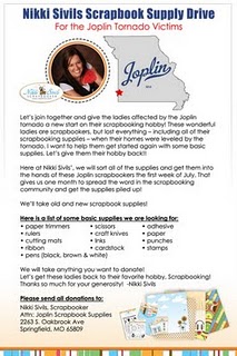 Nikki Sivils is doing a FABulous thing...a Scrapbook Supply Drive to benefit the Joplin Tornado Victims! I put together a USPS Flat Rate Priority box and sent it off last Saturday {sooo glad my Post office has Saturday hours} and I plan on sending 2 more boxes! Won't you help and/or Spread the word?