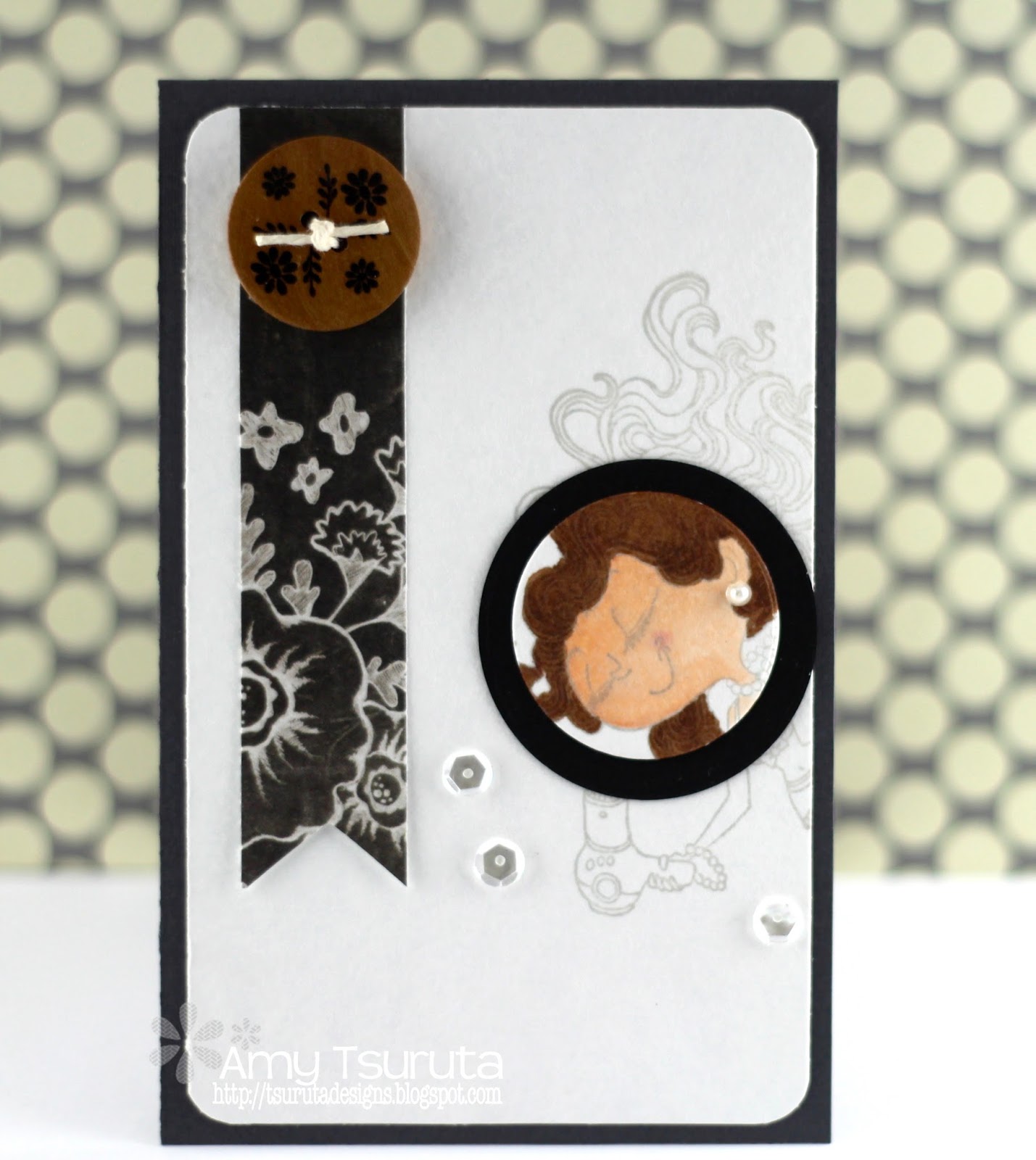In an effort to work on my 2014 crafty goal, I tried a new to me technique, Spotlighting. I stamped the image in Fresh Ink Provincial Gray. I stamped it again on a scrap piece of watercolor paper and used circle dies to cut out a portion of the image. I colored it and backed it with a larger black circle and adhered it to the panel. I glammed up it up by added some Neat & Tangled sequins.