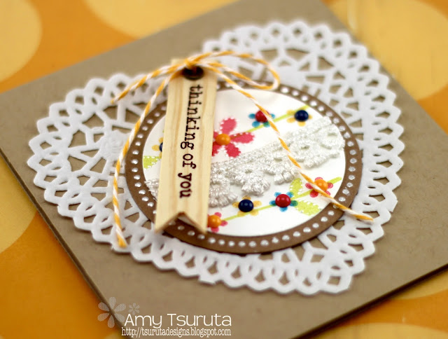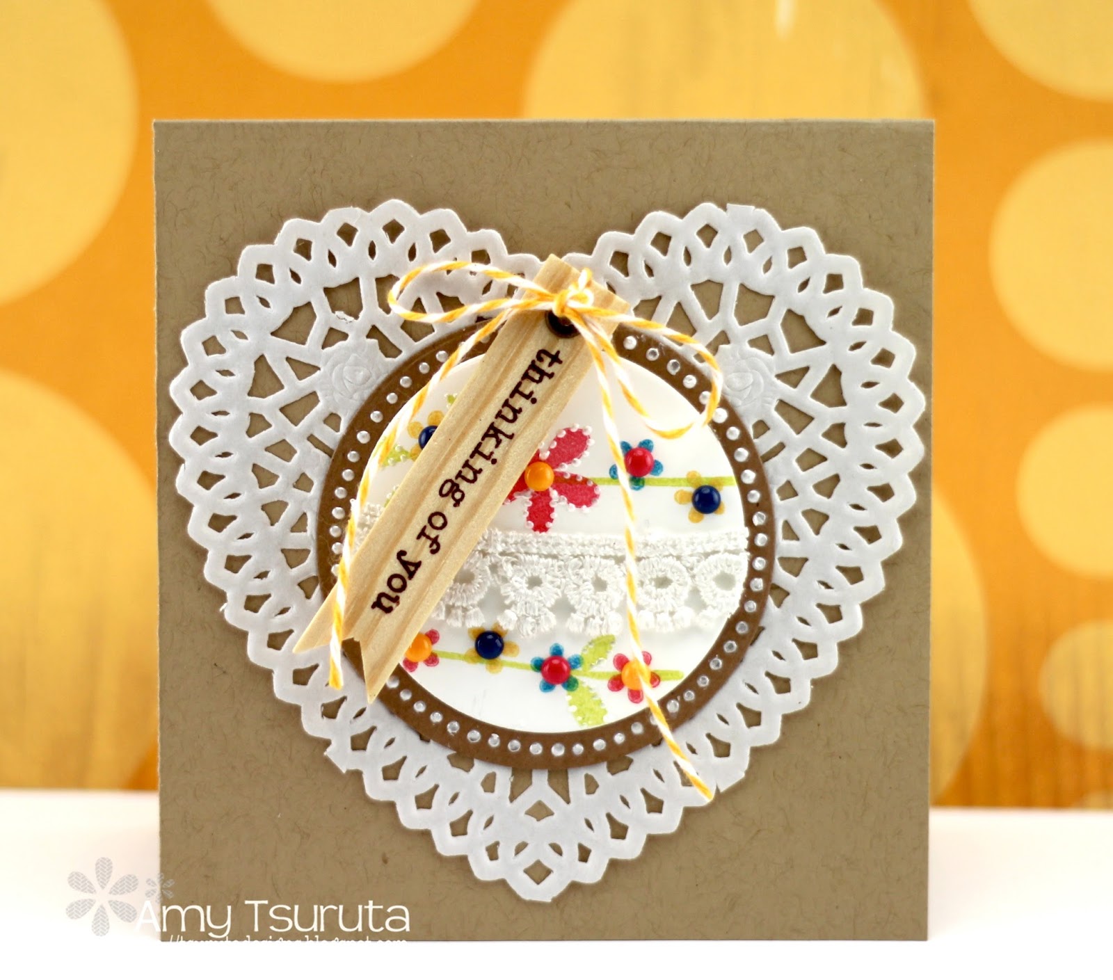 Such am utterly delightful and sweet card, Amy!! The wood veneer sentiment and doily are a sweet and unexpected combination!