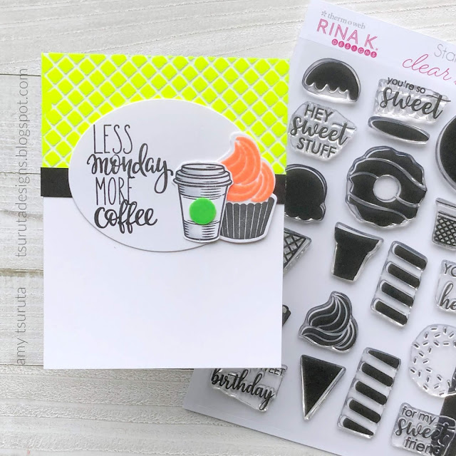One of the things that I received was the Rina K Designs StampnStencil Stamp Set, Sweet Stuff with the coordinating die set. Let's chat about my first card: