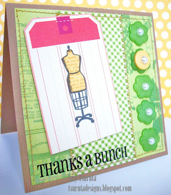 Everything is Cosmo Cricket Material Girl except the mini dressform...isn't it sweet? It is by Invoke Arts...the buttons are from my stash, the pearls are by Want 2 Scrap and the sentiment is SRM....Everything is nestled on a GMund base (it has fabbie wood texture)...4.25 x 4.25...